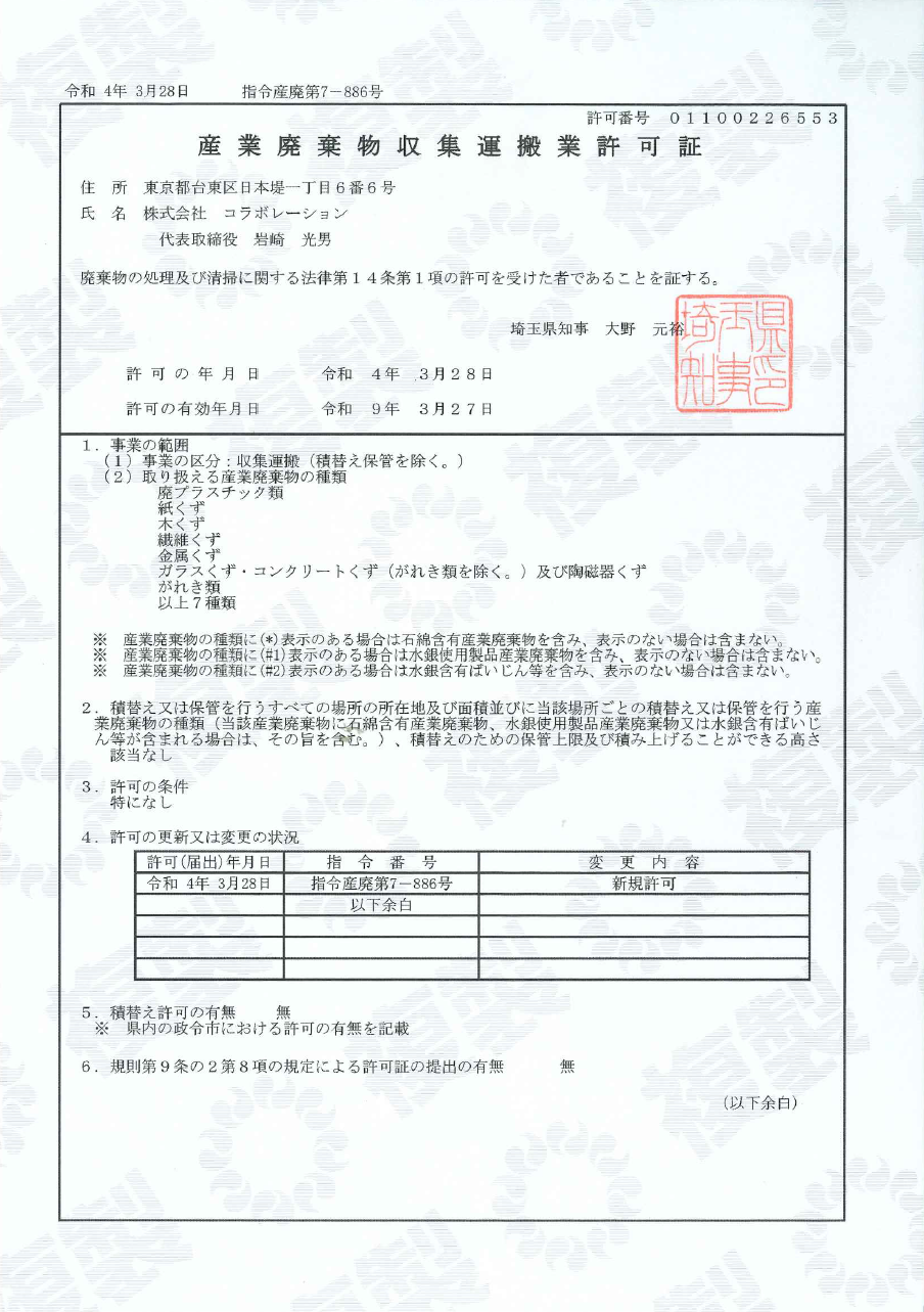 | 産業廃棄物収集運搬許可 埼玉県 許可番号 第01100226553 |